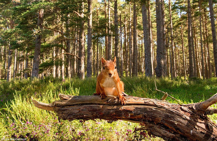 17. 苏格兰高地,一只红松鼠正在一截断木上休息,满脸好奇地看着摄影师Lyle MacCalmont。
