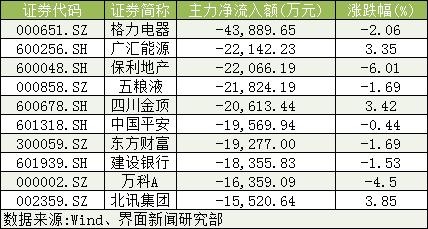 沪深两市主力资金净流出额超1亿元的个股数量为23只。格力电器(000651.SZ)、广汇能源(600256.SH)、保利地产(600048.SH)主力净流出额居两市个股前三,分别为4.39亿元、2.21亿元、2.21亿元。