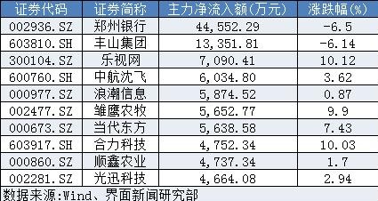 剔除尚未开板的新股,全天沪深两市主力净流入额超过1亿元的个股共计2只。郑州银行(002936.SZ)、丰山集团(603810.SH)成为最受主力追捧的两只个股,其净流入额分别为4.46亿元、3.83亿元。值得注意的是,乐视网(300104.SZ)和合力科技(603917.SH)遭遇主力资金抢筹后涨停。