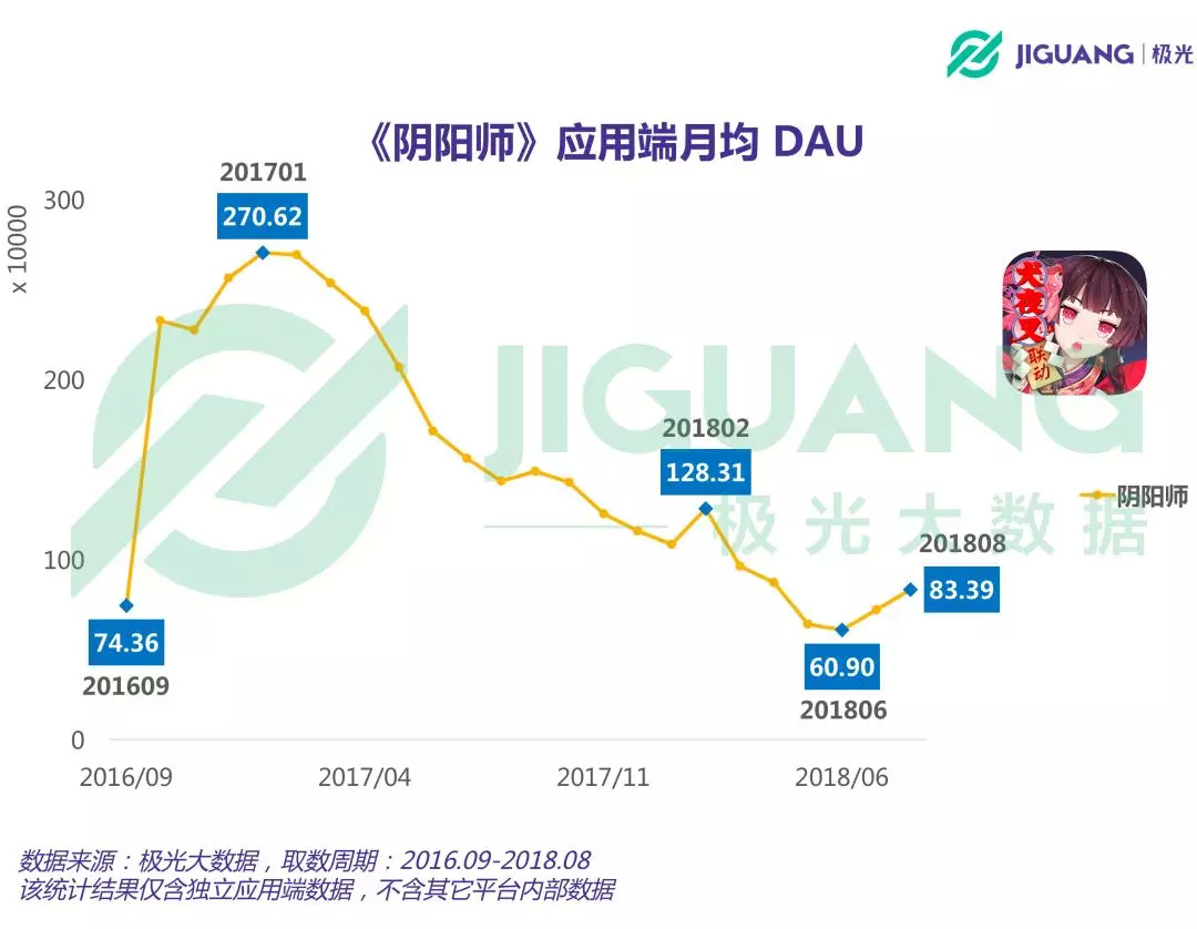 作为一款迅速引爆舆论的手游,《阴阳师》的月均DAU数值在上线首月便达到74.36万,次月更是成功突破200万关口。在2017年1月,《阴阳师》的月均DAU数值迎来了上线后高峰,达到270.62万,随后开始回落。