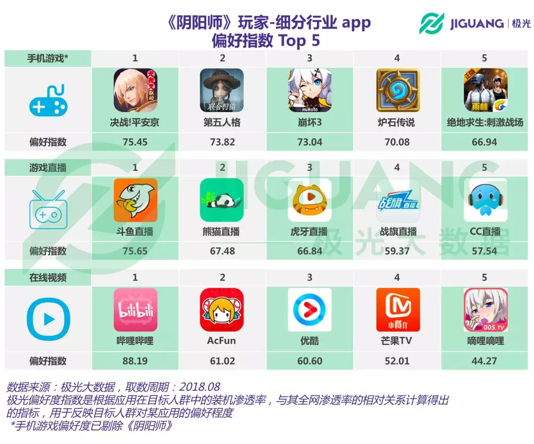 在手机游戏应用上,《阴阳师》玩家偏好度最高的是《决战!平安京》、《第五人格》和《崩坏3》,前两款均为网易旗下手游。对于游戏直播平台,《阴阳师》玩家最偏好斗鱼直播、熊猫直播和虎牙直播。与此同时,《阴阳师》玩家对哔哩哔哩和AcFun两款二次元视频站点均有着较高的偏好度。