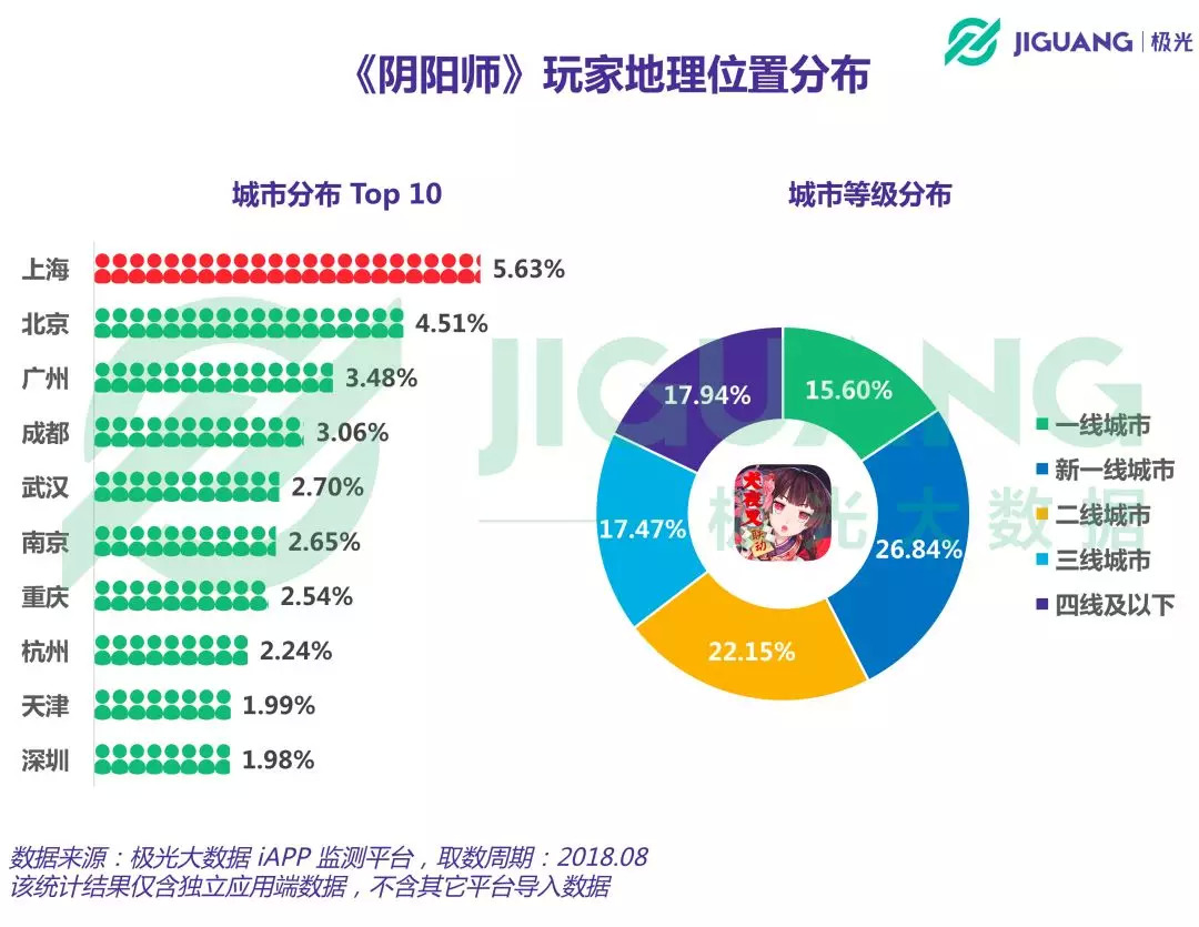 用户城市分布结果显示,《阴阳师》玩家占比最高的城市依次为上海、北京、广州和成都,4个城市所占的用户比例分别为5.63%、4.51%、3.48%和3.06%,其余城市的用户占比均不足3%。