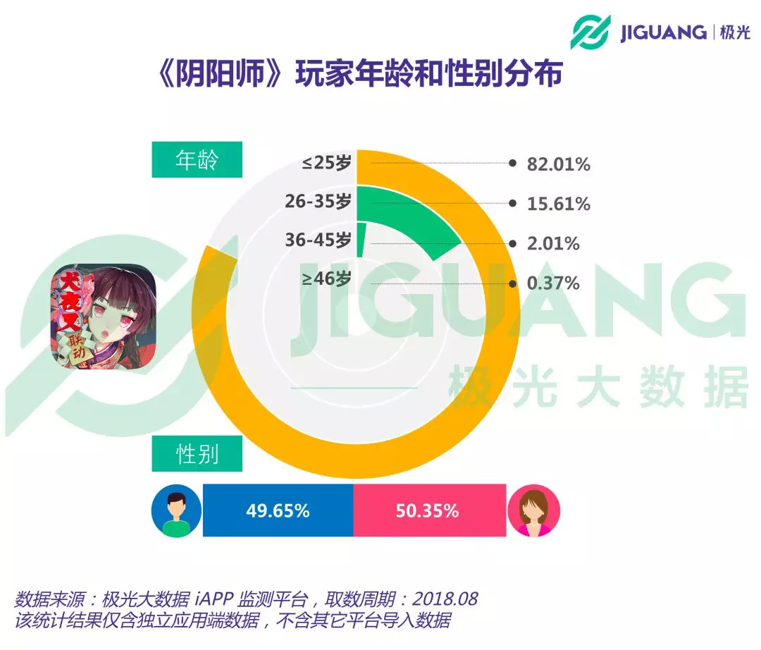 根据极光大数据的统计结果,《阴阳师》玩家的年轻化特征非常显著,25岁及以下用户的占比高达82.01%,还有15.61%的用户年龄分布在26-35岁之间。用户性别分布结果显示,《阴阳师》的玩家性别分布相对均衡,女性玩家的占比仅略高于男性。