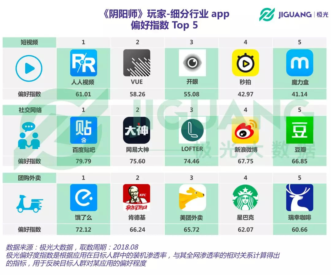 在短视频应用中,最受《阴阳师》玩家偏好的是人人视频、VUE和开眼。而在社交网络领域,《阴阳师》玩家偏好度最高的是百度贴吧,其次为网易旗下的两款社交应用网易大神和LOFTER。而在团购外卖应用上,《阴阳师》玩家最偏好饿了么、肯德基和美团外卖。