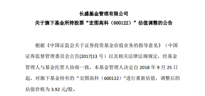 9月26日,长盛基金发布了关于下调“宏图高科”估值的公告,宣布自9月25日起,对旗下基金持有的“宏图高科”进行重新估值,调整后的估值价格为3.92元/股,相当于停牌前股价的6个跌停。