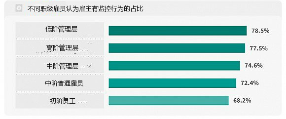 近四分之三的员工,无论男女,都怀疑老板在监视他们的工作活动。这种认知在不同职位和行业类型上存在一定出入:较低的管理层级对此体悟最深,有78.5%的职员认为雇主在监视他们,这一指标在新入职的员工中只占68.2%。行业分布上,广告和和营销领域占比最高(88.6%),排名其次的是数据处理和信息服务行业(85.6%)——两类严重依赖科技和电脑使用的行业。