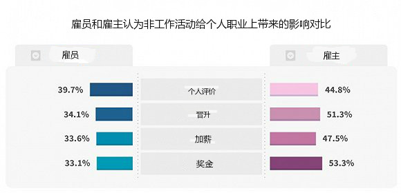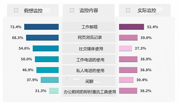 调查中另一个有趣的分野是,如果在工作期间被监控到进行非工作的活动,职员们更倾向认为个人表现评估将受到影响,但雇主们显然把问题看得更为严重,超过50%的雇主认为,这将与该职员的职业晋升和奖金直接挂钩。