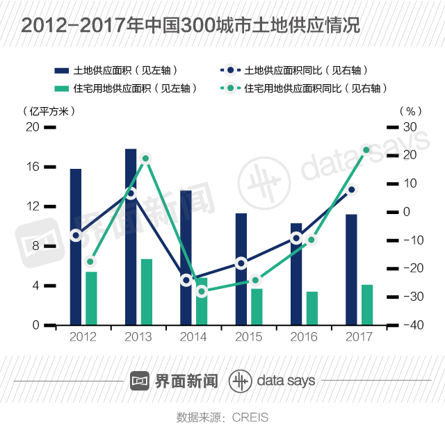 从土地供应来看,根据CREIS数据,2012-2017年,中国300城市土地供应面积下降趋势有所扭转。2017年,中国300城市土地、住宅用地供用面积分别为11.2亿平方米和4.1亿平方米,增速由负转正。