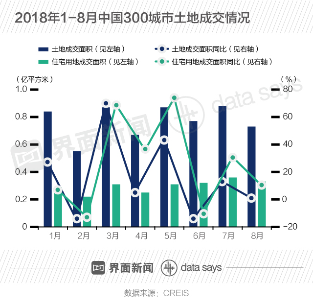 2018年8月,中国300城市土地和住宅成交面积环比下降,较去年同期基本持平。