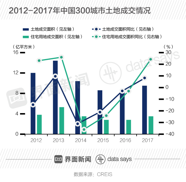 从成交情况来看,2012-2017年,中国300城市土地成交面积下降趋势也有所扭转。2017年中国300城市土地和住宅用地成交面积分别为9.5亿平方米和3.5亿平方米,结束了之前连续三年的下滑。