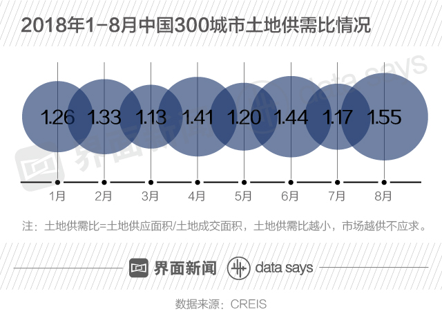 2018年1-8月,中国300城土地供需比震荡上行,8月份供需比达今年最高水平,为1.55。