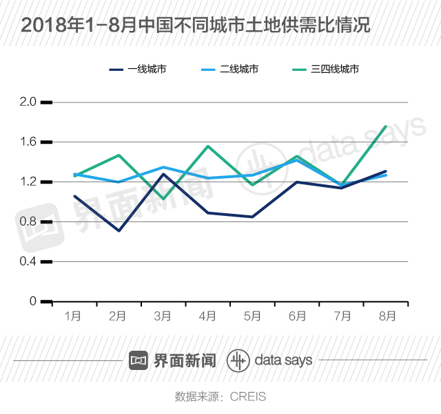 分城市来看,2018年8月各线城市土地供需比环比上升。其中三、四线城市供需比明显上升,二线城市供需比相对平稳,一线和三、四线城市供需比均达到年内至今最高水平。