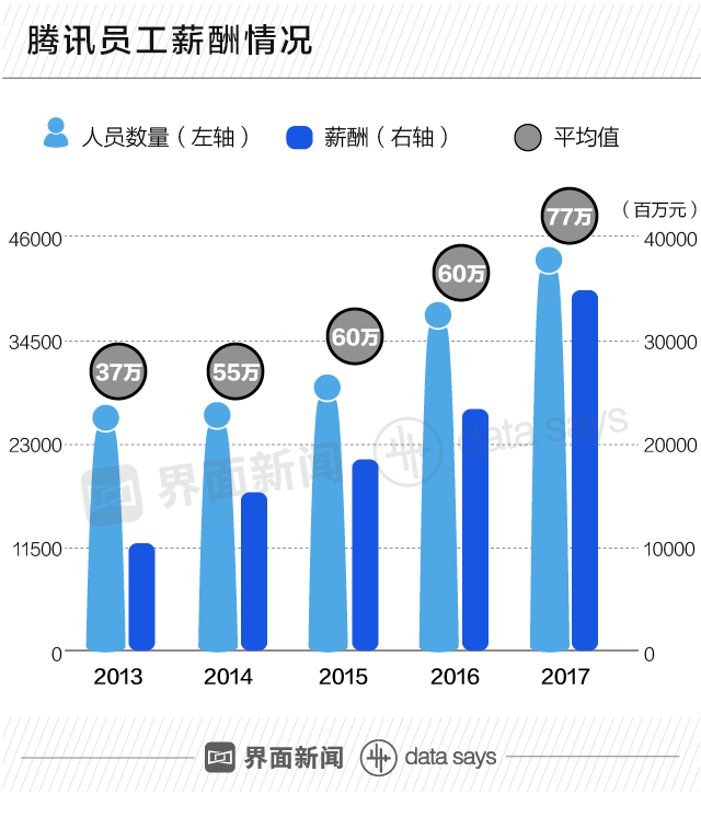 随之增长的还有人均薪酬。腾讯的人均年薪酬从2013年的37万元增长到了77万元,增长率为108%。