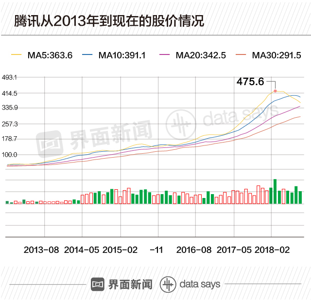 2017年11月是腾讯股价飙升的又一个里程碑。当月,腾讯所投资的阅文集团、搜狗、易鑫集团三家公司陆续在香港和美国上市,这为腾讯带来了充足的财务回报。各种消息刺激下,腾讯股价在当月突破400港元,并在2018年2月达到了历史最高值每股475港元。