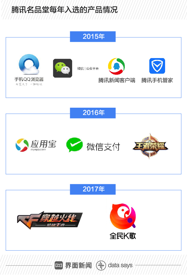 以腾讯的这几年的名品堂为例,2015年,手机QQ浏览器、微信公众平台、腾讯新闻客户端、腾讯手机管家4款产品登上了殿堂。到了2017年,则只有2款产品,穿越火线手游和全民K歌。