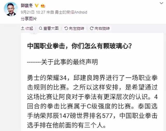 郭晨冬发文《中国职业拳击,你们怎么有颗玻璃心》作为结尾,直言“世界拳坛都这么牛逼了中国拳击还这么弱鸡”,重申打造第五大拳击组织想法,称“中国缺的不是懂拳击的人,缺的是勇于改变现状勇于制定规则的人”。文末宣布勇士的荣耀年末会继续举办混合规则的跨界比赛,“如果你们中国职业拳击不来,我们会自行邀请国外的运动员来参加。”
