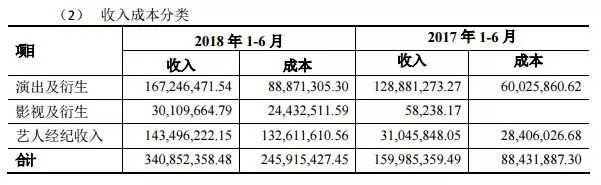 由2018年半年报清晰可见,演出及衍生这部分收入,较上年同期增长了29.77%,达到1.67亿;艺人经纪项目相关收入高达1.43亿,较上年同期增加362.21%。反观电影方面,只有3000余万元收入。