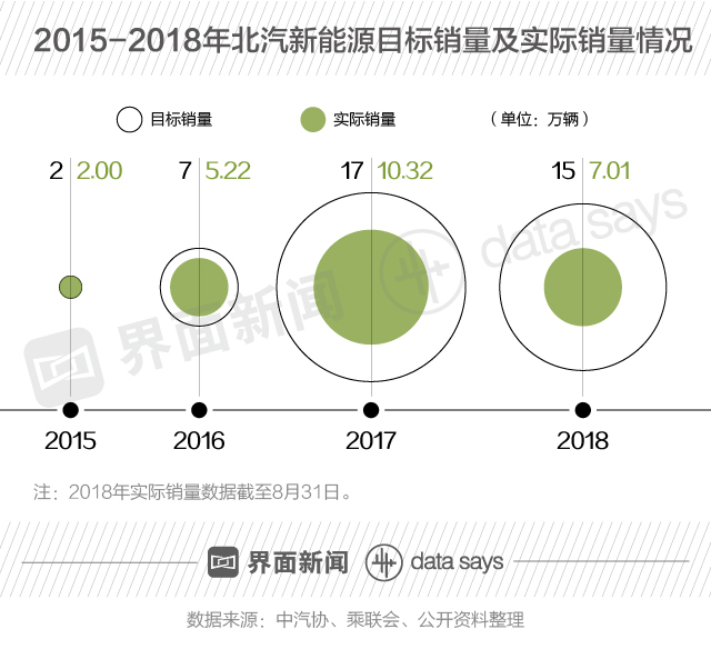 北汽新能源2018年目标销量为15万辆,截至2018年8月31日,其实际销量仅为7.01万辆,不足一半。北汽新能源此前已经连续两年实际销量不及目标。