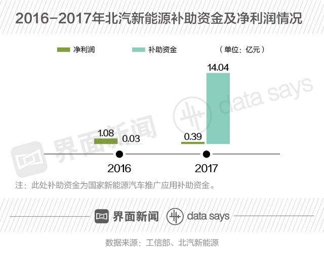 在净利润有所下滑的同时,北汽新能源获得的国家新能源汽车推广应用补助资金大幅上升。