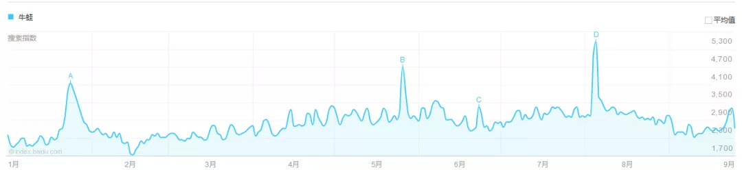百度搜索指数显示,“牛蛙”一词的热度,从今年1月份开始陡然升高,在5月中旬和7月中下旬迎来高峰,而7月中旬正是今年世界杯结束的时间。