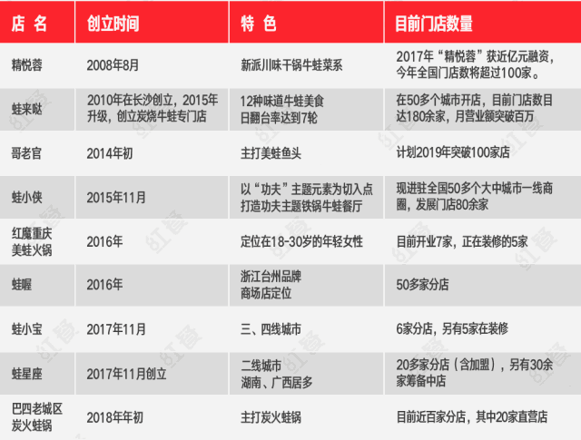 早前,牛蛙一直是川湘菜馆的一道菜品。2008年8月8日,悦蓉餐饮在上海徐汇飞洲国际开出第一家精悦蓉干锅牛蛙店,到2014年底,精悦蓉陆续在上海开出10家门店;2014年,川渝地区一家调料铺在上海开了第一家牛蛙专营店“哥老官”,主打美蛙鱼头;2015年,蛙来哒升级,创立炭烧牛蛙专门店。而后,牛蛙市场迅速被打开,以牛蛙为主打菜肴的特色餐厅也像雨后春笋一样发展起来,包括蛙小侠、巴四老城区炭火蛙锅、红魔美蛙火锅、啊咕咔咔、沪小二炭火蛙锅 、蛙鱼十三香炭火蛙锅、蛙小宝、蛙喔、蛙星座、淘蛙铁锅牛蛙等多个品牌。