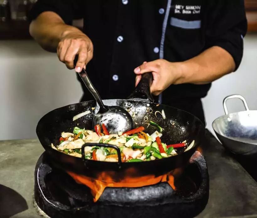 大厨现场制作高棉菜,从烹饪台现点现吃。酒店与当地小型走地鸡鸡场Eggscellent在内的多个本地独立食品生产商合作 。环保慈善与美味两不误。