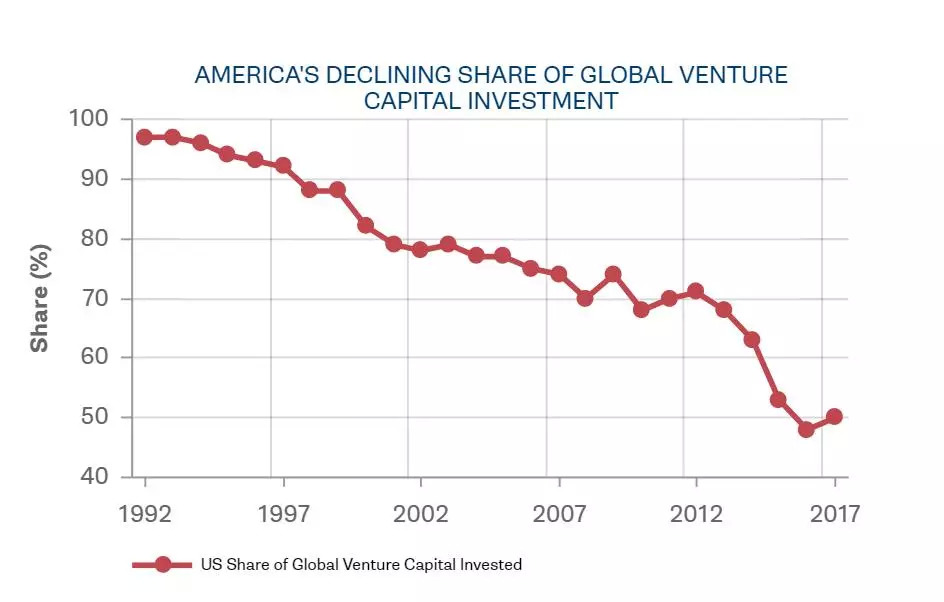 在上世纪90年代中期,美国的风险投资金额规模占全球总体规模的95%以上,到2012年,这一数字已降至70%,截至2017年底,美国在风险投资总额中的份额已降至50%。