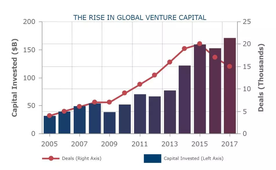 自2009年以来,全球创业和风险资本活动大规模扩张。随着许多国家摆脱了全球经济衰退的负面影响,技术创新的影响力开始扩张。全球风险资本投资从2010年的520亿美元激增至2017年的1710亿美元,增幅超过200%。风险投资交易从2010年的约8600笔交易增长至2017年的14800笔,增幅接近75%。
