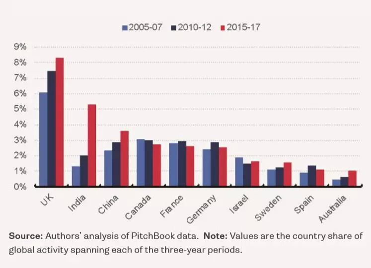 尤其需要注意的是,中国、印度和英国现在总共占全球创业交易数量和投资的三分之一,是十年前的2-3倍。随着风险投资的资金越来越多的流入亚太和欧洲地区,研究人员发现美国风险投资份额的下降趋势已经很难逆转。