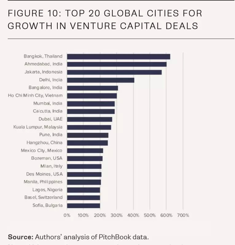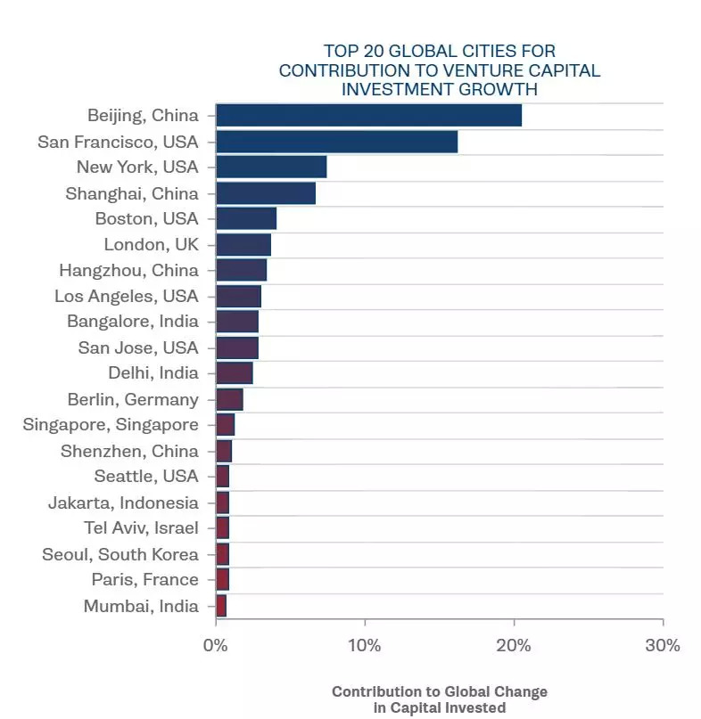 在对风险投资规模增长贡献最大的前50个城市中,有20个在美国,16个在亚太地区,11个在欧洲,2个在加拿大,1个在中东。