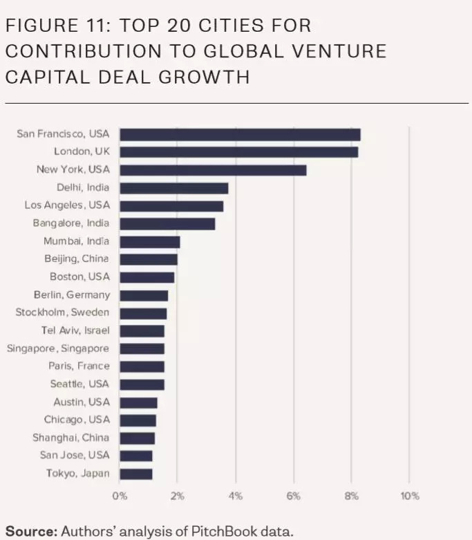 在对投资规模增长的贡献方面,较为传统的创业城市仍然有一定优势,例如旧金山(8.3%)、伦敦(8.2%)、洛杉矶(3.6%);几个印度城市表现也不俗,德里(3.8%)和班加罗尔(3.3%)的贡献率都超过3%;而北京、波士顿、柏林也都排在前十位。