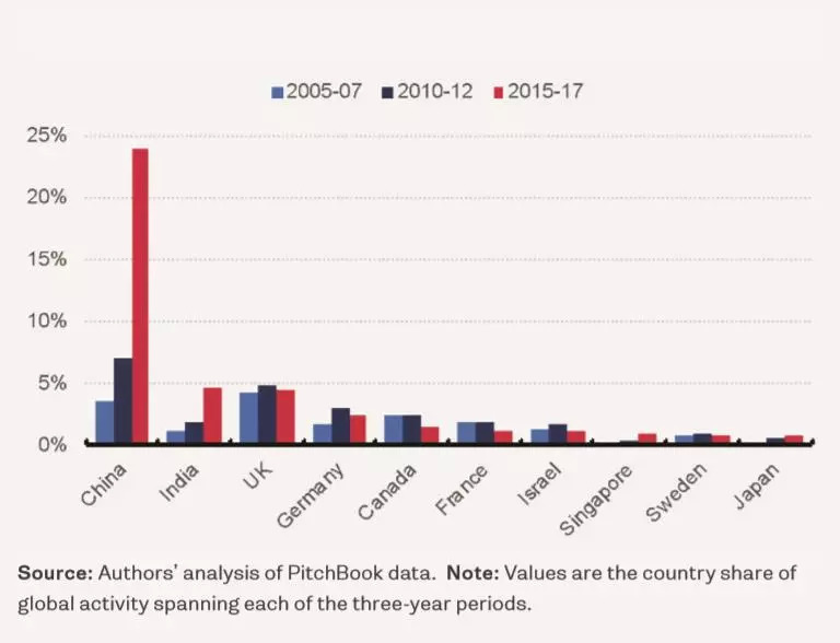 不出所料,风险投资资本全球化的最大贡献者和美国的份额减少的原因,是中国及其创业生态系统的迅速升级。