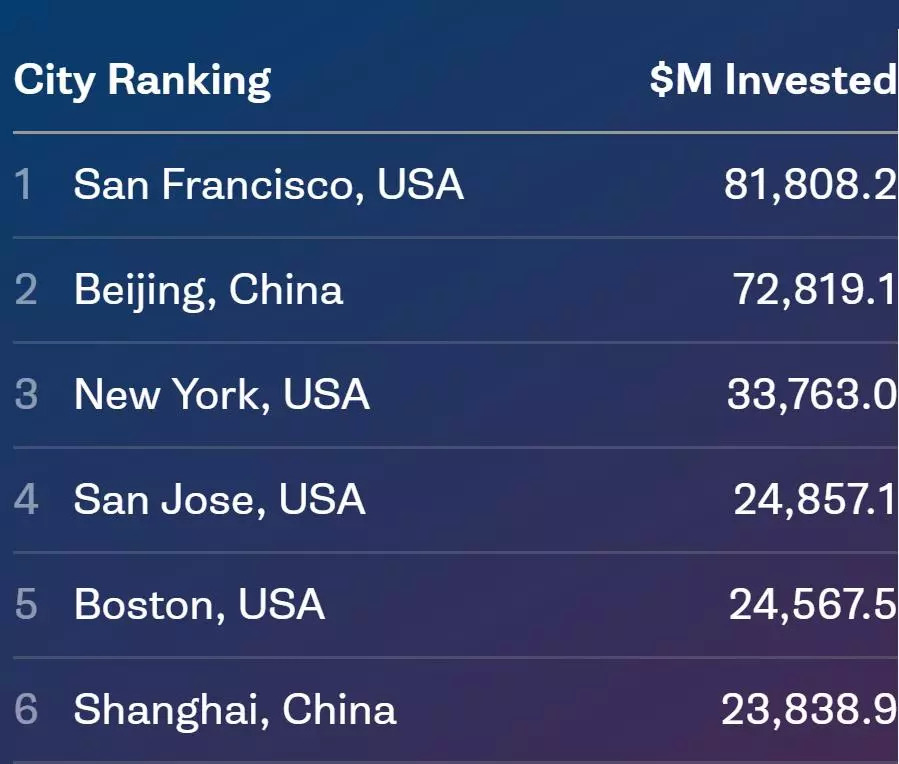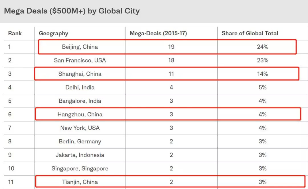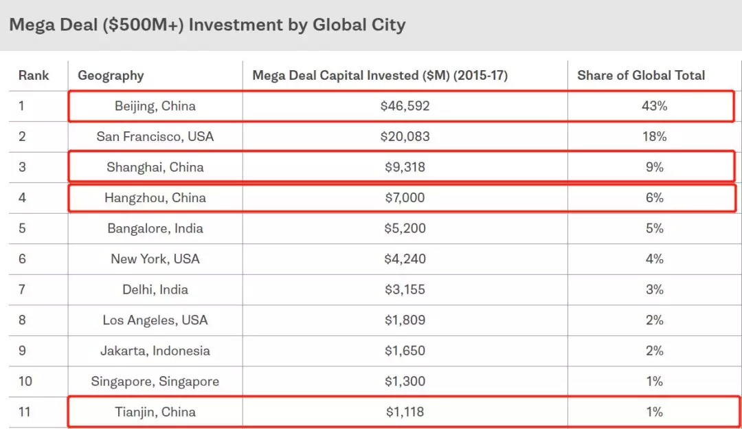 在同一时期,中国城市占所有“大笔交易”投资的几乎一半,其中北京和上海分别有19起和11起,远远多于美国旧金山之外的其他城市。