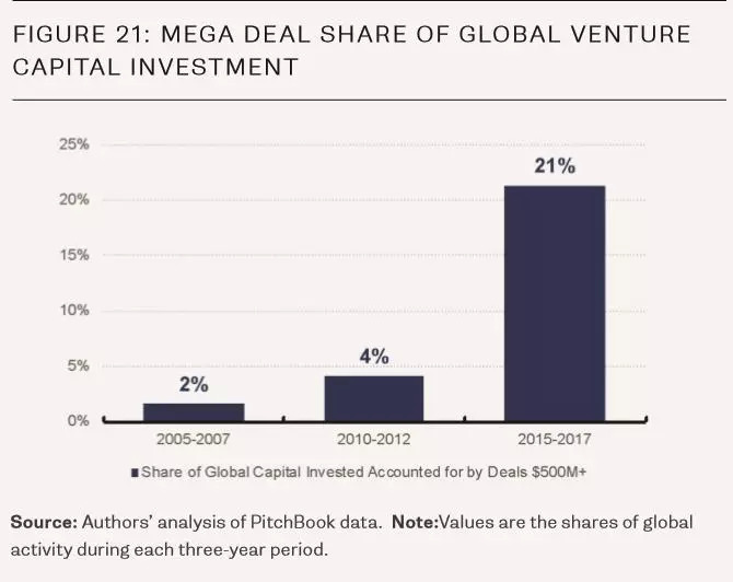 从2005年到2007年,只发生了两起“大笔交易”。 从2010年到2012年,发生了8笔此类交易;从2015年到2017年,全球共有80起“大笔交易”,其金额占风险投资总额的五分之一。