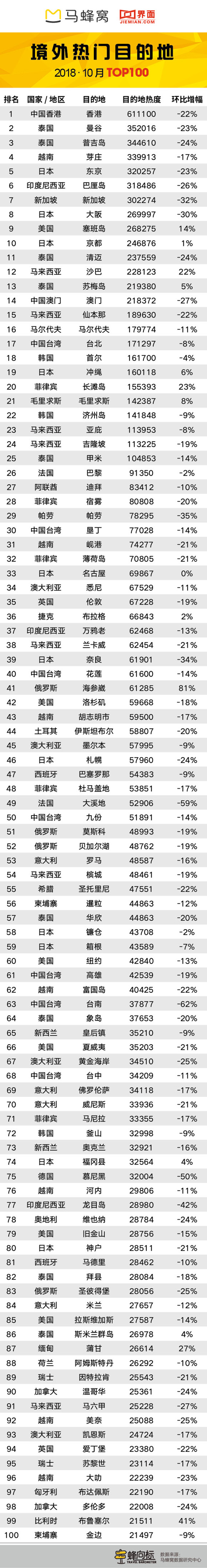 近日,马蜂窝旅游网联合界面推出2018年10月“旅游蜂向标”,基于马蜂窝旅游大数据平台,通过分析境内外100个目的地的热度变化,对10月旅游趋势进行了预测。