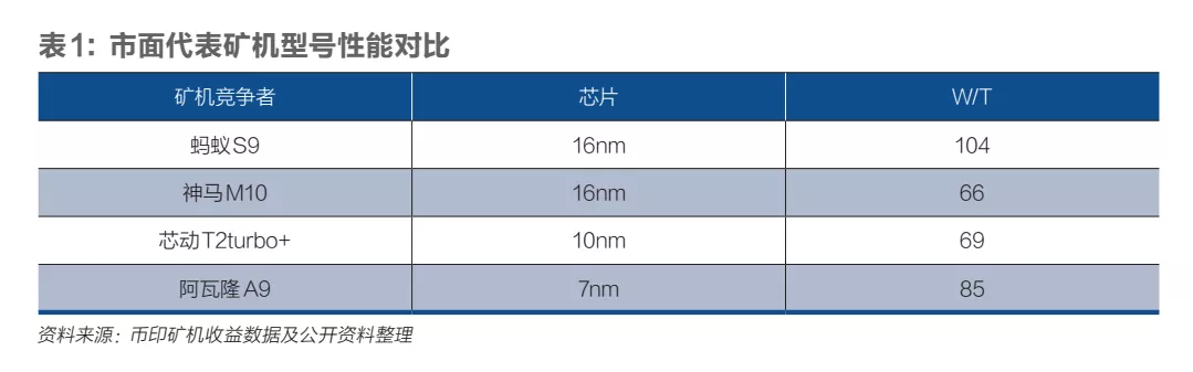 衡量矿机的核心指标为单位算力功耗(W/T),即矿机的功耗/算力。W/T决定矿机收益效果,算力跟收益有关,功耗跟成本有关。在相同计算能力的情况之下,矿机的功耗越小,意味着矿机的性能越好,净收益越大。