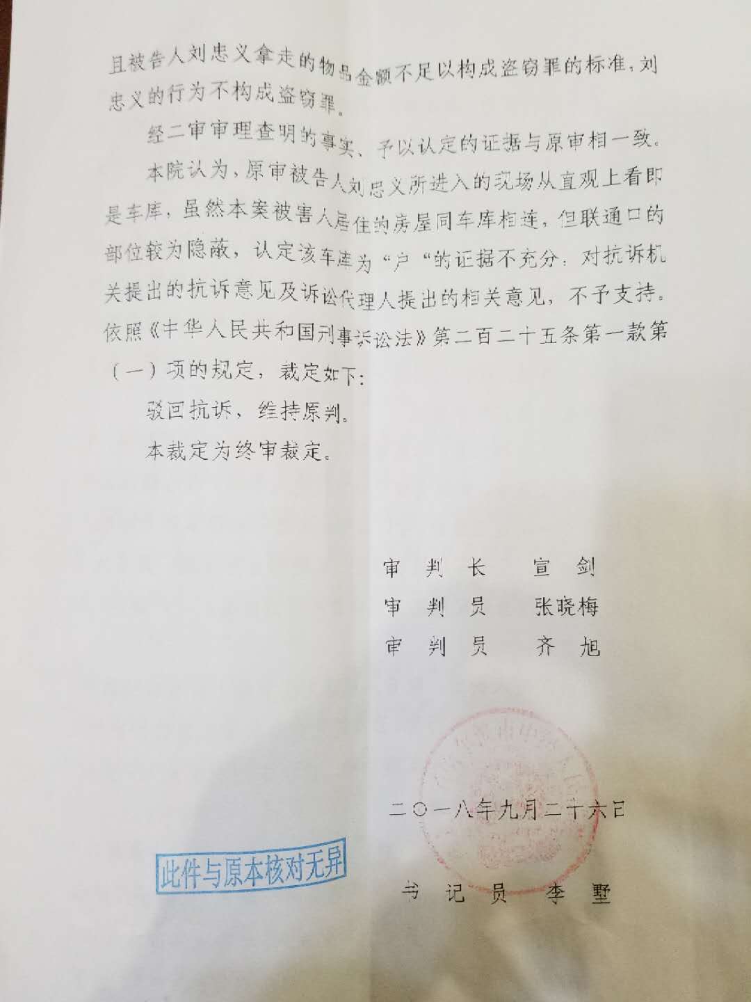 二审判决书显示,哈尔滨中级人民法院认为,经二审审理查明的事实,予以认定的证据与原审相一致。刘忠义所进入的现场从直观上看即是车库,虽然赵某居住的房屋同车库相连,但联通口的部位较为隐蔽,认定该车库为“户”的证据不充分,对抗诉机关提出的抗诉意见及诉讼代理人提出的相关意见,不予支持。所以驳回抗诉,维持原判。