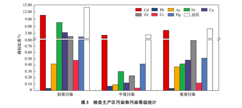 研究发现,总体来看我国五大粮食主产区以轻度污染为主。不过,绝大多数重金属元素污染比重呈上升趋势,其中镉(Cd)的污染比重增加趋势最为显著,点位超标比重从1.32%增至17.39%,20多年间增加了16.07%。镍(Ni)、铜(Cu)、锌(Zn)和汞(Hg)的点位超标比重分别增加了4.56%、3.68%、2.24%和1.96%。