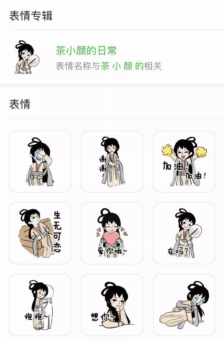 从类型上来看,这是一套静态平面表情包,采用个人账号在微信表情商城上线,以茶颜悦色LOGO中的古风少女为主角,精选了16个微信常用聊天场景。
