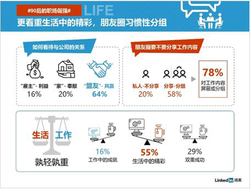 职场关系更平等、更自由,人们更加关注如何分配工作和生活的精力,近八成人希望公私界限分明,该屏蔽就屏蔽,该分组就分组,互不干扰。还有朋友圈里只晒生活的人,就像活在工作烦恼之外,通常10个人里有2个吧。