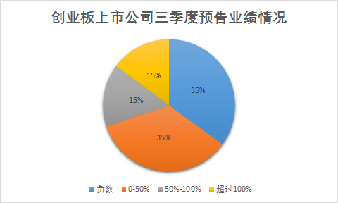另一个数据的回落也指向创业板上市公司盈利能力的下滑。数据显示,创业板预计前三季度业绩增幅超过100%的个股共计109只,50%-100%之间的有112只,0-50%之间的有255只,净利润同比增速预计为负的257只。与去年Q3相比,业绩预计翻倍个股占比下滑近1个百分点。