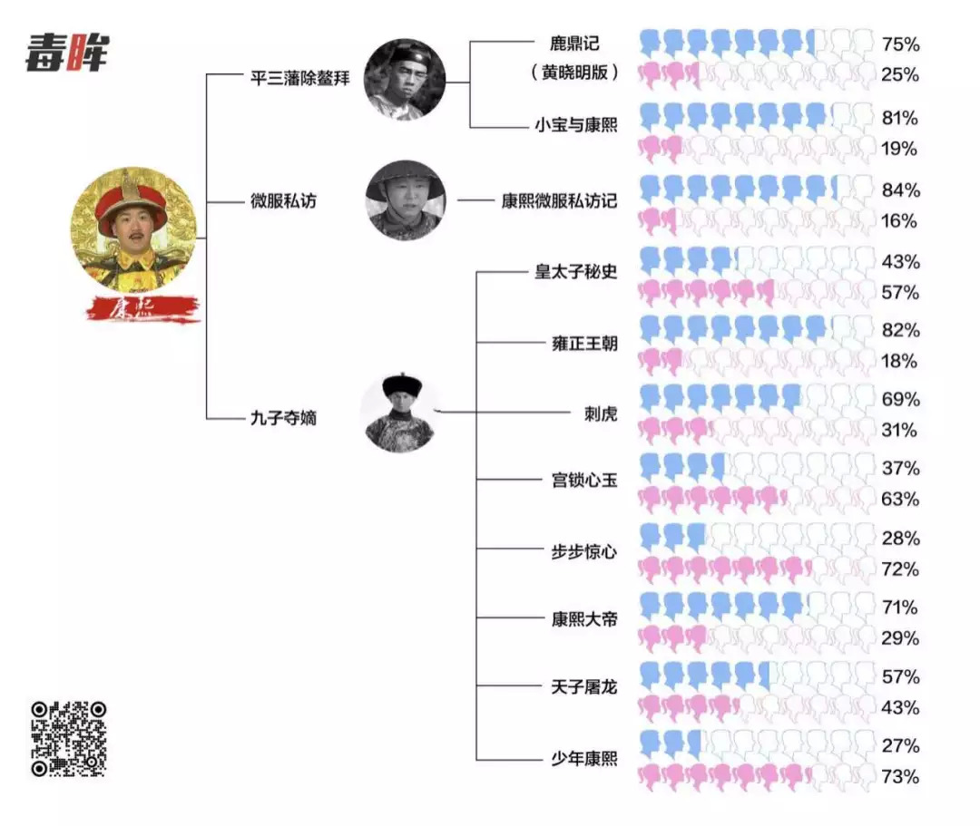 毒眸统计发现:在74部剧集中,康熙25部、雍正22部、乾隆27部。