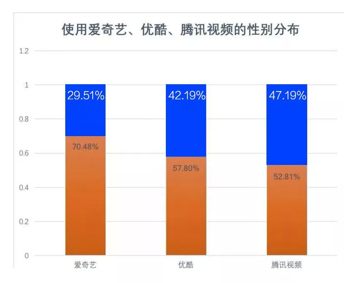 与此同时,视频网站兴起,吸引不少电视观众,而相比于电视渠道,互联网渠道的女性用户占比往往更高——2017年易观数据显示,优酷、爱奇艺和腾讯三家视频网站的女性用户超过50%,最高达到70.48%。