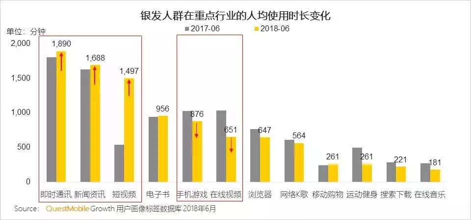 Questmobile数据显示出,新闻资讯、短视频抢夺了银发人群越来越多的注意力。以微信为代表的即时通讯应用占据银发人群最多时间。短视频对银发人群时间争夺最突出,其次是新闻资讯,很多银发人群甚至减少了玩游戏、看长视频的时间。