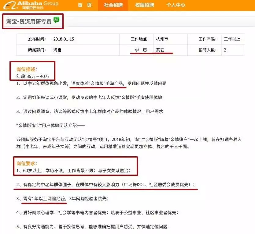 在今年一月,阿里巴巴就发布了一条“年薪40万聘请资深60岁以上产品体验师”的招聘信息。招聘启示中,阿里巴巴开出年薪35万元至40万元,招聘两名淘宝网资深用户研究专员。