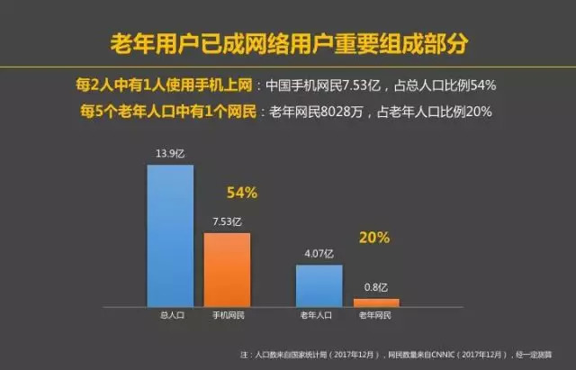 中国移动互联网经历过三波人口红利:第一波是由PC端转战移动端的核心互联网用户;第二波是在城镇化过程中成长起来的80、90后小镇青年;而第三波将是年龄超过45岁的中老年人群。