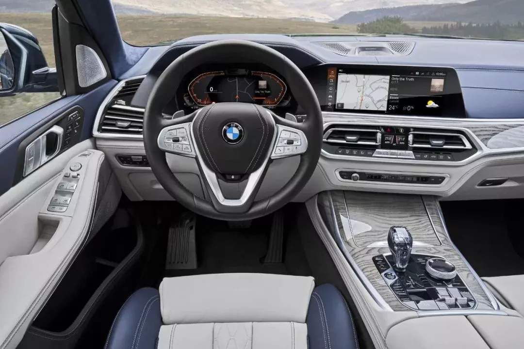 内饰方面,BMW X7 配备智能互联驾驶座舱(BMW Live Cockpit Professional),包括第七代BMW iDrive和最新设计的智能显示系统,以及12.3英寸的高清组合仪表和中央控制显示屏。