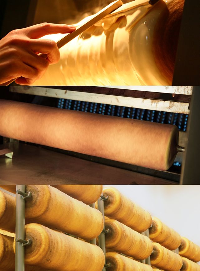 等烤至金黄色,熟得差不多了,继续下一层,一层层不断反复,同时也需要控制火力,糕点师傅必须根据气温、湿度来调整火焰强度,一边注意指尖的触感,一边关注蛋糕色泽和香气的微小变化,一层层烤制,既不能烤过头,又需要尽可能留下水分。