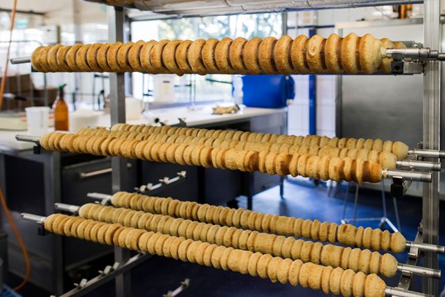 年轮蛋糕需要不同于一般烤箱的特殊烘烤装置,糕点师傅将各种原料按照一定比例、一定工序混合打发,制成胚料蛋奶糊,再将胚料慢慢地淋/刷/涂在机器上不断旋转的炙叉(spit)上进行烘烤。
