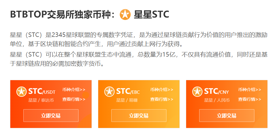 在一家名为“BTBTOP(易币)”、自称位于新加坡的数字货币交易所网站上,星星以非常显眼的方式在首页做详细介绍,并提供多种兑换渠道,包括币币交易、法币交易。